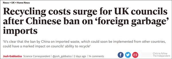 中國自今年1月起為配合新推出的環(huán)境政策,拒收大部分的外國紙類和,英國地方政府對此叫苦連天。根據(jù)調(diào)查發(fā)現(xiàn),因中國等國家決定不再回收來自外國的垃圾,造成2成英國地方政府只能自行救濟(jì)處理垃圾而造成預(yù)算吃緊。當(dāng)?shù)卣粲鯓I(yè)者,應(yīng)共同負(fù)擔(dān)激增的回收成本,并減少使用不易回收的包裝材料。據(jù)《英國獨立報》10月20...