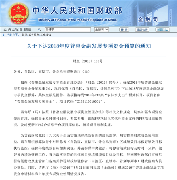 近日,根據(jù)《普惠金融發(fā)展專(zhuān)項(xiàng)資金管理辦法》(財(cái)金〔2016〕85號(hào)),確定2018年度普惠金融發(fā)展專(zhuān)項(xiàng)資金分配權(quán)重為1,向各省、自治區(qū)、直轄市、計(jì)劃單列市財(cái)政廳(局)下達(dá)2018年度普惠金融發(fā)展專(zhuān)項(xiàng)資金預(yù)算的通知,隨文公布了獲得以獎(jiǎng)代補(bǔ)資金項(xiàng)目名單,并在財(cái)政部網(wǎng)站上予以公布。與陜西省環(huán)保集團(tuán)合作的陜...