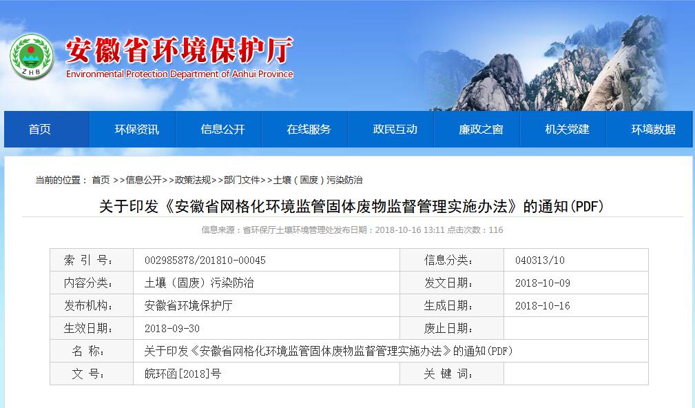 日前,環(huán)保廳公布《安徽省網格化環(huán)境監(jiān)管監(jiān)督管理實施辦法》,詳情如下:各市、省直管縣環(huán)保局、住房城鄉(xiāng)建設委、城管局、國土資源局、農委、水利局、林業(yè)局、安全監(jiān)管局:根據(jù)《安徽省人民政府關于建立固體廢物污染防控長效機制的意見》(皖政〔2018〕51號)要求,制定了《安徽省網格化環(huán)境監(jiān)管實施辦法》,現(xiàn)印發(fā)給...