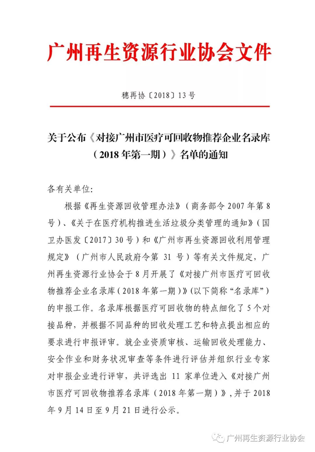 日前協(xié)會發(fā)布了廣州再生資源行業(yè)協(xié)會關于公布《對接廣州市推薦企業(yè)名錄庫(2018年第一期)》名單的通知,發(fā)布了《對接廣州市醫(yī)療可回收物推薦企業(yè)名錄庫(2018年第一期)》名單,涉及9家符合資質的企業(yè),具體內容如下:各有關單位:根據(jù)國家、省、市有關文件的要求和規(guī)定,我會于8月份開展了對接廣州市醫(yī)療可回收...