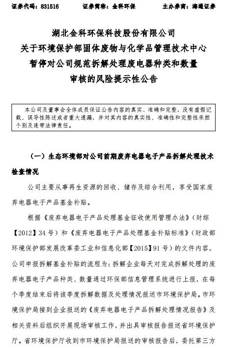 10月17日,發(fā)布公告稱,公司主營業(yè)務業(yè)務因未通過2018 年第二批次拆解處理技術復核,已暫停工作,該業(yè)務營收約占公司主營業(yè)務營收的70%,預計將對金科環(huán)保的經(jīng)營情況產(chǎn)生較大的不利影響。公告顯示,金科環(huán)保廢舊電器拆解業(yè)務未通過審核的原因在于:1、存在集中大規(guī)模拆解疑似拼裝、仿制液晶類廢電器并申領基金...