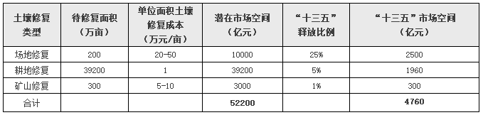 行業(yè)潛在市場(chǎng)空間分析根據(jù)土地類型的不同,土壤修復(fù)可分為、和耕地修復(fù)。綜合中國(guó)產(chǎn)業(yè)信息網(wǎng)、前瞻產(chǎn)業(yè)研究院研究報(bào)告及多家券商的行業(yè)市場(chǎng)分析報(bào)告信息,結(jié)合2017年化工產(chǎn)業(yè)十余省市90%的企業(yè)關(guān)停轉(zhuǎn)移現(xiàn)狀,和國(guó)家政策相關(guān)所提出的指標(biāo):到2020年現(xiàn)有位于城鎮(zhèn)內(nèi)人口密集區(qū)域的?;飞a(chǎn)企業(yè)全部啟動(dòng)搬遷改造。...