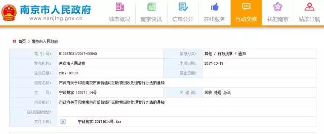 10月19日,南京市政府公布了《南京市低價(jià)值可回收物回收處理暫行辦法》,根據(jù)辦法規(guī)定,城市管理部門負(fù)責(zé)管理轄區(qū)內(nèi)低價(jià)值可回收物回收工作,并通過政府采購(gòu)方式向企業(yè)購(gòu)買低價(jià)值可回收物的回收、處理服務(wù)。辦法自今年11月20日起施行,有效期3年。 《辦法》公布后,南京成為繼廣州之后,又一個(gè)出臺(tái)有關(guān)低值可回收...