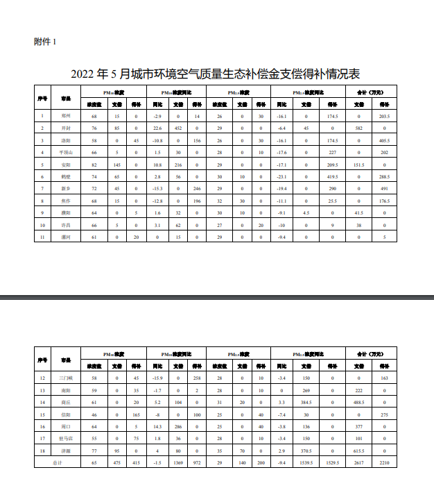 根據(jù)《河南省污染防治攻堅戰(zhàn)領(lǐng)導(dǎo)小組辦公室關(guān)于印發(fā)河南省城市環(huán)境空氣質(zhì)量生態(tài)補(bǔ)償辦法(試行)等辦法的通知》(豫環(huán)攻堅辦〔2020〕15號)要求,河南省生態(tài)環(huán)境廳廳對各省轄市的城市環(huán)境空氣質(zhì)量生態(tài)補(bǔ)償金的支償、得補(bǔ)情況進(jìn)行了計算。截止2022年5月,各省轄市共支償城市環(huán)境空氣質(zhì)量生態(tài)補(bǔ)償金2617萬元,...