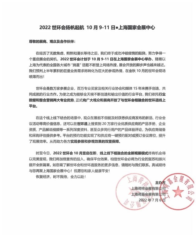 尊敬的展商、觀眾及合作伙伴: 在經(jīng)歷了無數(shù)焦慮,煎熬和漫長等待之后,我們終于成功沖破疫情的阻撓,努力爭得一個重啟展會的契機,2022世環(huán)會計劃于10月9-11日在上海國家會展中心舉辦。隨著以上海為代表的全國各大城市“摘星”話題不斷登上網(wǎng)絡熱搜,展會開放的腳步聲也越來越近。我們...