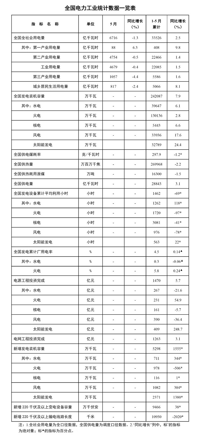6月16日,國家能源局發(fā)布1-5月份全國電力工業(yè)統(tǒng)計數(shù)據(jù)。截至5月底,全國發(fā)電裝機(jī)容量約24.2億千瓦,同比增長7.9%。其中,風(fēng)電裝機(jī)容量約3.4億千瓦,同比增長17.6%;太陽能發(fā)電裝機(jī)容量約3.3億千瓦,同比增長24.4%。 1-5月份,全國發(fā)電設(shè)備累計平均利用1462小時,比上年同期減少69...