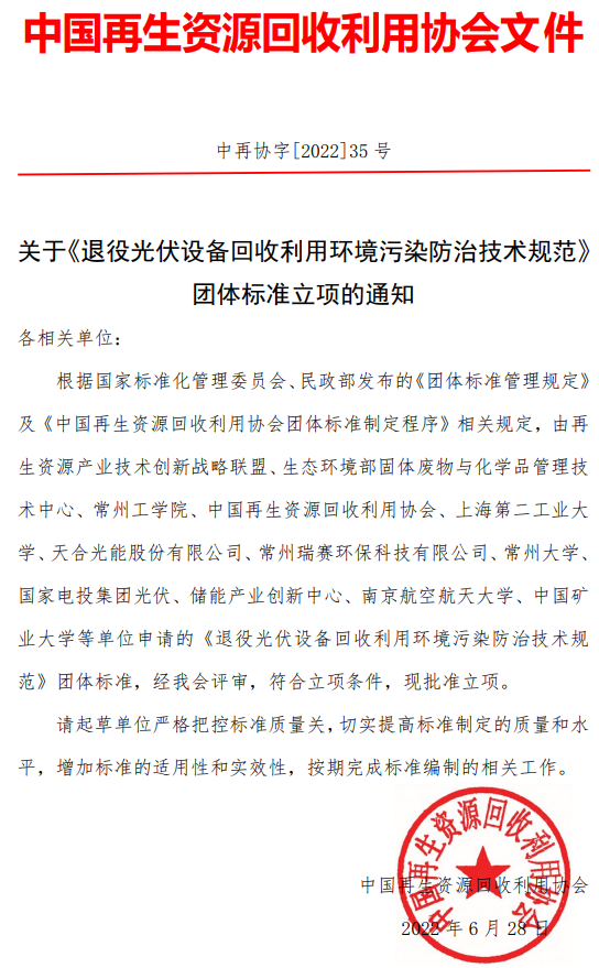 2022年6月28日,中國(guó)再生資源回收利用協(xié)會(huì)發(fā)布通知,明確《退役光伏設(shè)備回收利用環(huán)境污染防治技術(shù)規(guī)范》符合立項(xiàng)條件,批準(zhǔn)立項(xiàng)。中國(guó)再生資源回收利用協(xié)會(huì)要求起草單位嚴(yán)格把控標(biāo)準(zhǔn)質(zhì)量關(guān),切實(shí)提高標(biāo)準(zhǔn)制定的質(zhì)量和水平,增加標(biāo)準(zhǔn)的適用性和實(shí)效性,按期完成標(biāo)準(zhǔn)編制的相關(guān)工作。通知全文如下:中國(guó)再生資源回收利...