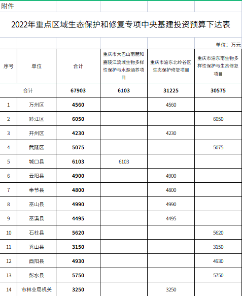 重慶市財政局關于下達2022年重點區(qū)域生態(tài)保護和修復專項中央基建投資預算的通知有關區(qū)縣(自治縣)財政局,市林業(yè)局: 根據《財政部關于下達2022年重點區(qū)域生態(tài)保護和修復專項(第一批)中央基建投資預算的通知》(財建〔2022〕127號)、《財政部關于下達2022年重點區(qū)域生態(tài)保護和修復專項(第二批)中...