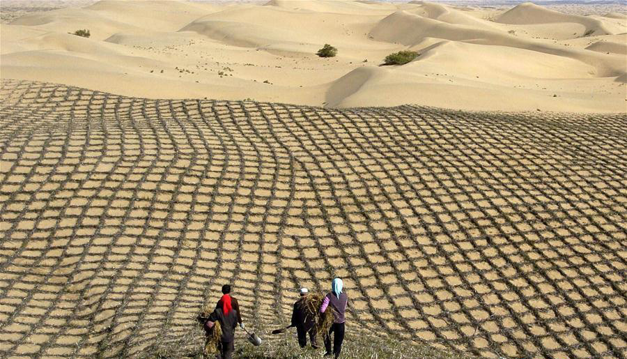 2007年10月19日 寧夏靈武市白芨灘國(guó)家級(jí)自然保護(hù)區(qū)職工扎草方格固沙。為了阻擋沙漠前進(jìn)的腳步,毛烏素沙漠西南邊緣成立了靈武市白芨灘防沙林場(chǎng)。經(jīng)過三代治沙人不懈地努力,植被覆蓋率已由最初的20%提高到如今的逾40%。2014年7月14日 寧夏彭陽縣效果良好。據(jù)了解,寧夏中部干旱帶及南部山區(qū)開展生態(tài)...