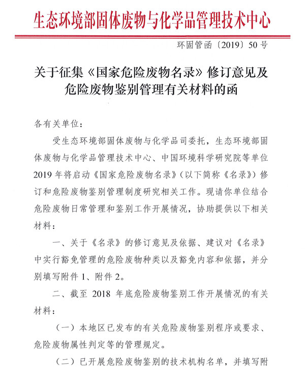 關(guān)于征集《國家危險(xiǎn)廢物名錄》修訂意見及危險(xiǎn)廢物鑒別管理有關(guān)材料的函原標(biāo)題:關(guān)于征集《國家危險(xiǎn)廢物名錄》修訂意見及危險(xiǎn)廢物鑒別管理有關(guān)材料的函