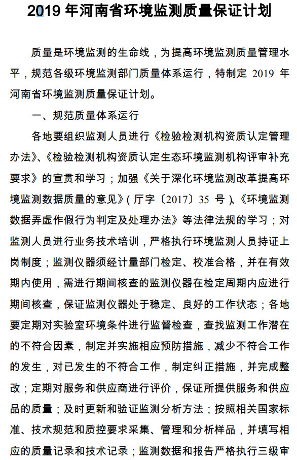 近日,河南省生態(tài)環(huán)境廳發(fā)布了2019年河南省環(huán)境監(jiān)測(cè)質(zhì)量保證計(jì)劃,全文如下:河南省環(huán)境保護(hù)廳辦公室關(guān)于印發(fā)2019年河南省環(huán)境監(jiān)測(cè)質(zhì)量保證計(jì)劃的通知各省轄市環(huán)保局、鄭州航空港經(jīng)濟(jì)綜合實(shí)驗(yàn)區(qū)規(guī)劃市政建設(shè)環(huán)保局:為貫徹落實(shí)中共中央辦公廳、國(guó)務(wù)院辦公廳《關(guān)于深化環(huán)境監(jiān)測(cè)改革提高環(huán)境監(jiān)測(cè)數(shù)據(jù)質(zhì)量的意見(jiàn)》(廳...