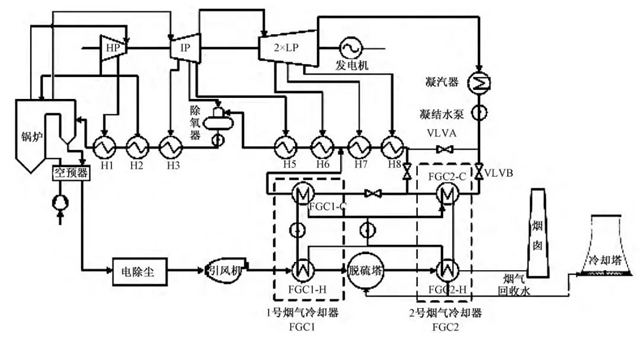 應(yīng)用蒸汽相變技術(shù)與氟塑料換熱器,設(shè)計了協(xié)同顆粒物脫除和水分回收的電站鍋爐煙氣余熱利用系統(tǒng)。系統(tǒng)在脫硫塔進、出口設(shè)置兩級間接傳熱式煙氣冷卻器,氟塑料換熱器吸收的排煙余熱通過閉式循環(huán)水和板式換熱器傳遞給凝結(jié)水。一級煙氣冷卻器降低脫硫塔入口煙溫以減小脫硫水耗,二級煙氣冷卻器冷凝煙氣中的水蒸氣并脫除煙氣中的...
