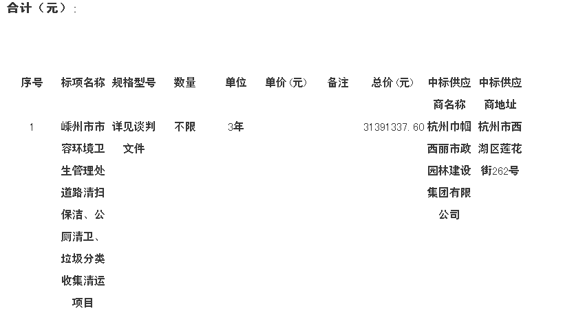 嵊州市公共資源交易中心關(guān)于嵊州市市容環(huán)境衛(wèi)生管理處道路清掃保潔、公廁清衛(wèi)、垃圾分類收集清運(yùn)項(xiàng)目的結(jié)果公告一、 采購人名稱:嵊州市市容環(huán)境衛(wèi)生管理處二、 采購項(xiàng)目名稱:嵊州市市容環(huán)境衛(wèi)生管理處道路清掃保潔、公廁清衛(wèi)、垃圾分類收集清運(yùn)項(xiàng)目三、 采購項(xiàng)目編號:szc2018-71四、 采購組織類型:政府集...