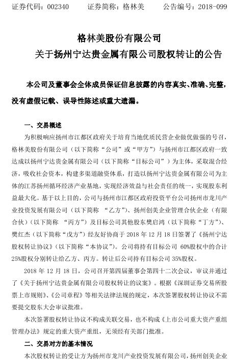 12月18日,格林美發(fā)布公告,公司將持有揚州寧達貴金屬有限公司60%股權(quán)中的合計25%股權(quán)分別轉(zhuǎn)讓給揚州市江都區(qū)政府投資平臺公司揚州市龍川產(chǎn)業(yè)投資發(fā)展有限公司、揚州創(chuàng)美企業(yè)管理合伙企業(yè)(有限合伙)。轉(zhuǎn)讓后公司持有目標(biāo)公司35%股權(quán)。揚州寧達貴金屬有限公司主要從事鍺金屬回收、工業(yè)固體廢棄物填埋、電子廢...
