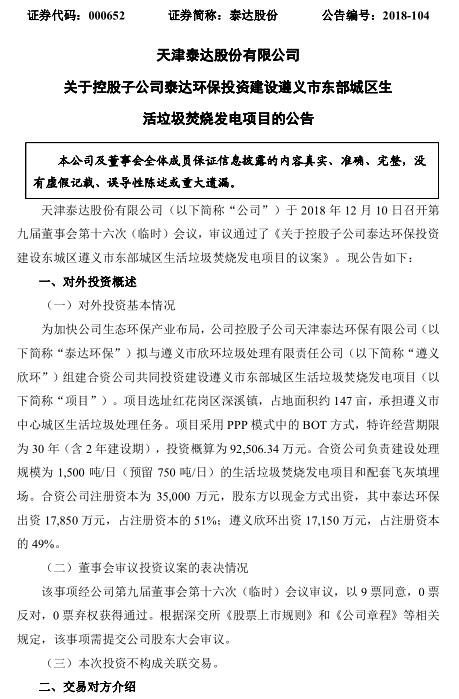 日前,泰達環(huán)保發(fā)布公告,公司控股子公司天津泰達環(huán)保有限公司(以下簡稱“泰達環(huán)?!保M與遵義市欣環(huán)垃圾處理有限責(zé)任公司(以下簡稱“遵義欣環(huán)”)組建合資公司共同投資建設(shè)遵義市東部城區(qū)生活垃圾焚燒發(fā)電項目(以下簡稱“項目”)。項目選址紅花崗區(qū)深溪鎮(zhèn),占地面積約 147 畝,承擔(dān)遵義市中心城區(qū)生活垃圾處理任...