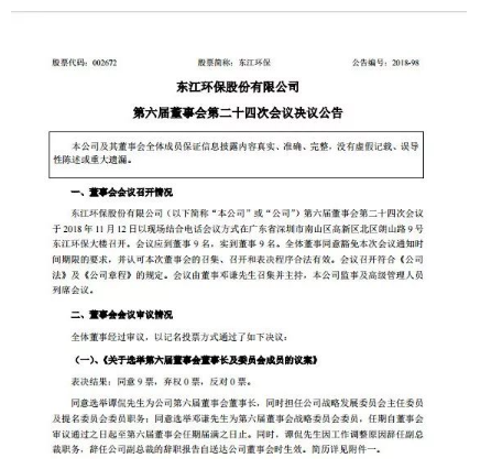 東江環(huán)保發(fā)布公告,于2018年11月12日舉行的第六屆董事會第24次會議,董事會選舉譚侃為第六屆董事會董事長,任期自董事會審議通過之日起至本屆董事會屆滿之日止。董事會選舉譚侃為第六屆董事會戰(zhàn)略發(fā)展委員會主席,選舉鄧謙為第六屆董事會戰(zhàn)略發(fā)展委員會委員,與曲久輝共同構成第六屆董事會戰(zhàn)略發(fā)展委員會。董事會...