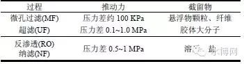 膜按表面孔徑的大小,一般可分為微濾膜、超濾膜、納濾和反滲透膜,其分離目標(biāo)見表1。常用于MBR 處理工藝中的是微濾膜和超濾膜。
