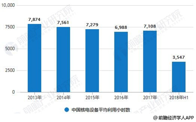 2014年中國核電裝機容量為977萬千瓦,到了2015年中國核電裝機容量突破1000萬千瓦。截止到2017年中國核電裝機容量為1434萬千瓦。2017年中國核電設備平均利用小時數(shù)為7108小時,截止到2018年H1中國核電設備平均利用小時數(shù)達到了3547小時。