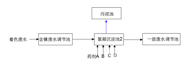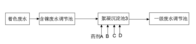 項目中含鎳廢水主要由著色工序產(chǎn)生,由于鎳是第一類污染物,必須車間排放口達標。項目擬對含鎳廢水單獨預(yù)處理,使總鎳車間排放口能達標,再將處理后的廢水匯入綜合調(diào)節(jié)池進行后續(xù)處理。含鎳離子廢水處理工藝原理如下: