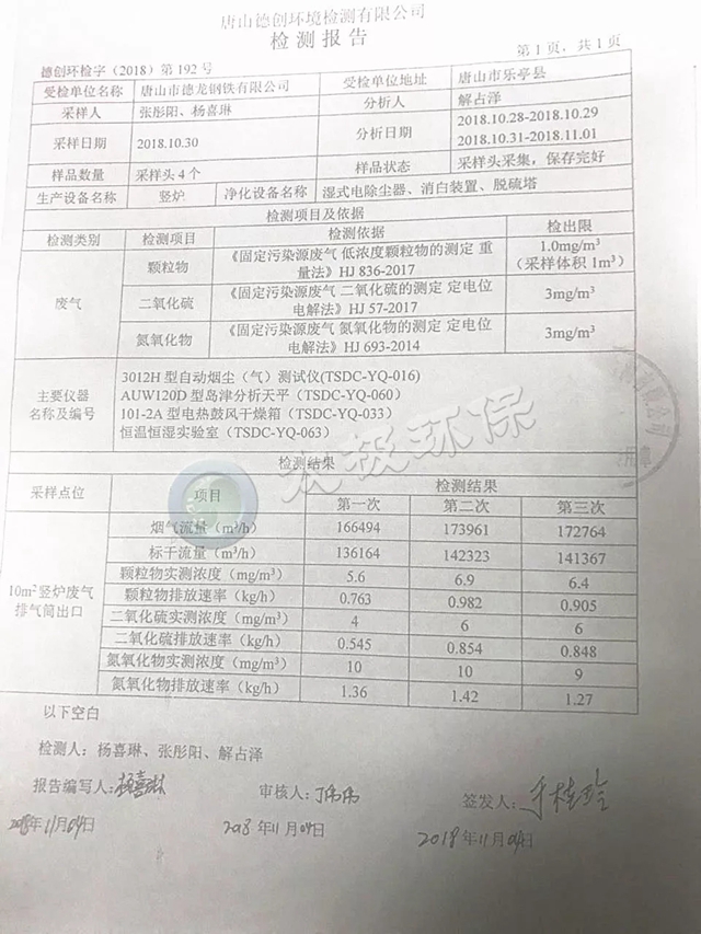 唐山德龍10m2豎爐脫硫除塵+脫白工程檢測報(bào)告
