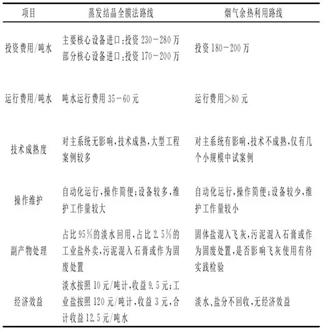 蒸發(fā)結(jié)晶全膜法工藝路線與煙氣余熱利用工藝路線比選。煙氣余熱利用廢水零排放是近來(lái)比較熱的技術(shù),經(jīng)常拿來(lái)跟蒸發(fā)結(jié)晶式零排放工藝相提并論,但它不能實(shí)現(xiàn)水資源和鹽資源的回收和再利用。2種工藝路線比較結(jié)果,見(jiàn)表2。