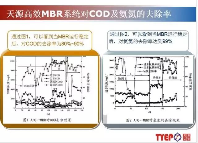 天源環(huán)保有10多年的深入摸索,對內(nèi)置式MBR,外置式MBR分別具備大量工程應(yīng)用,對其優(yōu)缺點很明顯,并且針對性解決各自的瓶頸問題。由上圖可以看到當(dāng)MBR運行穩(wěn)定后,對COD的去除率為80%~90%,對氨氮的去除率達到99%。