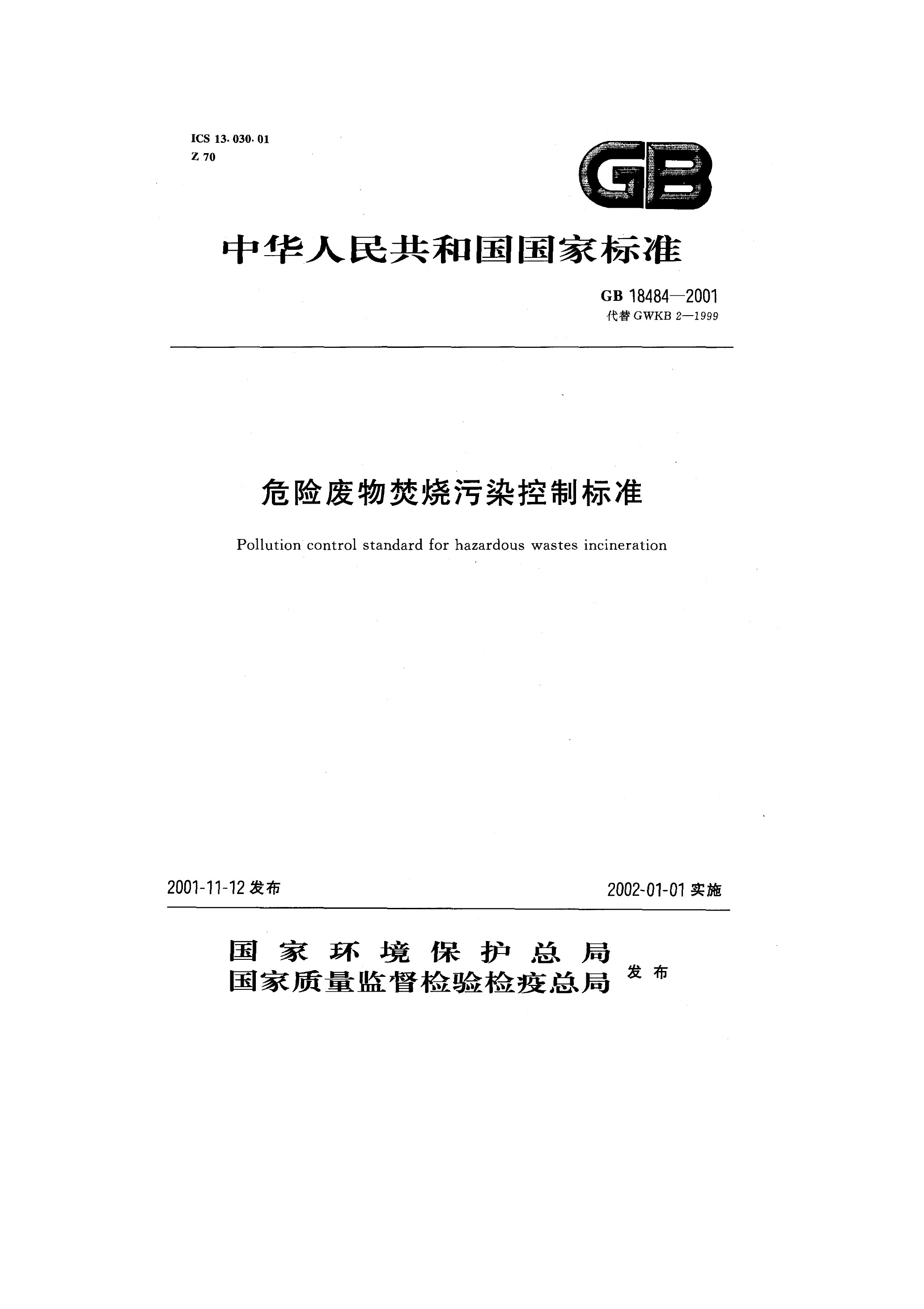危險廢物焚燒污染控制標準(GB18484-2001)