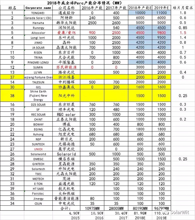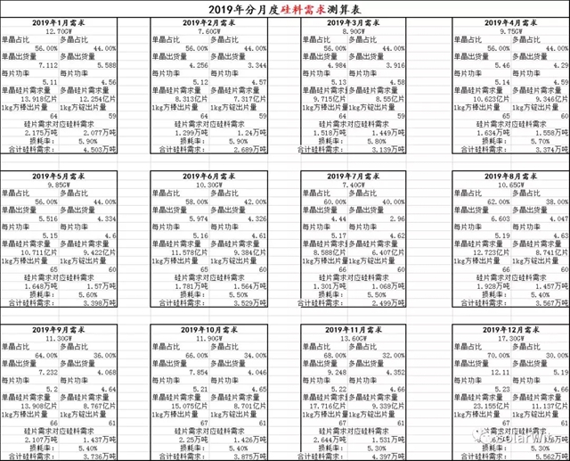 這個(gè)表格中的數(shù)據(jù)需要做一個(gè)說(shuō)明,根據(jù)對(duì)供應(yīng)鏈的追蹤:12月當(dāng)月Perc的有效電池產(chǎn)能為60GW,并沒(méi)有達(dá)到圖中所說(shuō)的81.9GW,這是因?yàn)閺你懪飘a(chǎn)能到有效產(chǎn)出還需要一個(gè)調(diào)試的過(guò)程。當(dāng)前有很多新建和技改的電池產(chǎn)能正在調(diào)試的路上,預(yù)期2019年3月份末會(huì)達(dá)產(chǎn),屆時(shí)每月對(duì)單晶硅片的需求量會(huì)達(dá)到12.1億片。