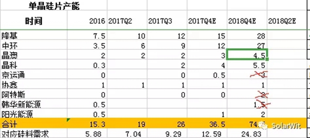 上面這張截圖是2017年年底總結(jié)的,現(xiàn)在回顧他發(fā)現(xiàn)基本不用修改,因?yàn)闆](méi)有新增的進(jìn)入者,反倒是有幾家公司并沒(méi)有如期達(dá)產(chǎn);京運(yùn)通原本計(jì)劃中的3GW產(chǎn)能現(xiàn)在也沒(méi)有蹤影;阿特斯之前拋出了雄心勃勃的計(jì)劃,但實(shí)際上目前只有24臺(tái)單晶爐做中試線;韓華新能源也同樣,并沒(méi)有有效產(chǎn)能出來(lái),依然需要通過(guò)外部采購(gòu)。當(dāng)前市場(chǎng)中有效的單晶硅片產(chǎn)能實(shí)際上只有四家但是由于晶科、晶澳只自用不外供,所以對(duì)于市場(chǎng)上第三方公開(kāi)對(duì)外銷售的產(chǎn)能,有效供給只有兩家:隆基和中環(huán),在硅片環(huán)節(jié),迅速地形成了雙寡頭壟斷的產(chǎn)業(yè)格局。這是供給端,我們?cè)倏纯磫尉Ч杵男枨蠖耍?/div>