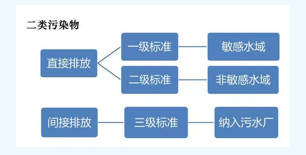 二類污染物92項(xiàng),在排污單位總排口采樣檢測,二類污染物根據(jù)去向分為三級(jí),排入特殊保護(hù)水域的執(zhí)行特殊保護(hù)水域標(biāo)準(zhǔn),排入Ⅲ類水及二類海域的執(zhí)行一級(jí)標(biāo)準(zhǔn),向非敏感水域直接排放水污染物的排污單位執(zhí)行二級(jí)標(biāo)準(zhǔn),間接排放水污染物則執(zhí)行三級(jí)標(biāo)準(zhǔn)。