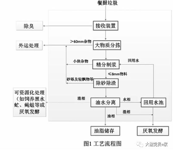 餐廚垃圾中的大塊金屬、瓷片、玻璃、塑料瓶蓋、貝殼、砂石、紙張等雜物被自動(dòng)分揀出來,外運(yùn)至生活垃圾焚燒發(fā)電廠。漿液經(jīng)加熱后分離出三種狀態(tài)的物料-水相、渣相、輕相(油水混合物料)。其中從輕相物料中分離出來的粗油脂儲(chǔ)運(yùn)后可進(jìn)一步加工制成生物柴油,作為飛機(jī)燃料使用;渣相物料,一路與水相進(jìn)行調(diào)配做厭氧發(fā)酵,產(chǎn)生的沼氣可發(fā)電,另一路可用于資源化利用,如飼養(yǎng)黑水虻、蠅蛆等。