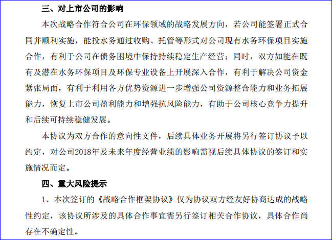 同時(shí),雙方如能在既有及潛在水務(wù)環(huán)保項(xiàng)目及環(huán)保專業(yè)設(shè)備上開展深入合作,有利于解決公司資金緊張局面,有利于利用各方優(yōu)勢資源進(jìn)一步增強(qiáng)公司資源整合能力和業(yè)務(wù)拓展能力,恢復(fù)上市公司盈利能力和增強(qiáng)抗風(fēng)險(xiǎn)能力,有助于公司核心競爭力提升和后續(xù)可持續(xù)穩(wěn)健發(fā)展。