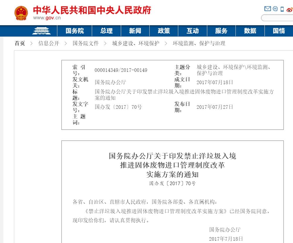 7月27日,國務(wù)院辦公廳正式發(fā)布禁止洋垃圾入境推進(jìn)固體廢物進(jìn)口管理制度改革實(shí)施方案。明確2017年年底前,全面禁止進(jìn)口環(huán)境危害大、群眾反映強(qiáng)烈的固體廢物;2019年年底前,逐步停止進(jìn)口國內(nèi)資源可以替代的固體廢物。