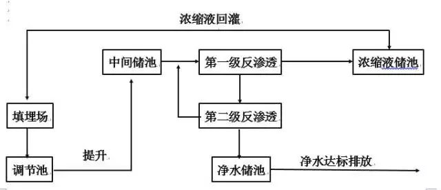 滲濾液直接進(jìn)行膜分離技術(shù)是指滲濾液不進(jìn)行生化處理,經(jīng)過簡單的預(yù)處理后直接進(jìn)入反滲透處理系統(tǒng),反滲透清液出水達(dá)標(biāo)排放,產(chǎn)生的濃縮液回灌填埋場或送城市污水處理廠,其工藝流程見圖2。