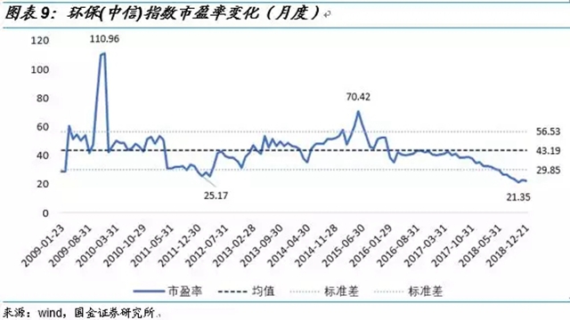 估值已到歷史底部。我們統(tǒng)計了2009年到2018年12月21日的環(huán)保(中信)指數(shù)的月度估值變化,2018年10月底行業(yè)估值跌至21.35X,目前維持在22X左右,處于近幾年的估值底部。