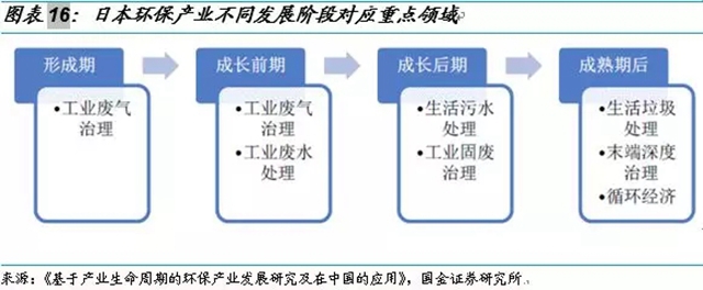 美國的環(huán)保行業(yè)在1990 年以后,末端治理領域產(chǎn)值增速放緩,資源回收領域逐漸發(fā)展; 2007 年開始,末端治理逐漸保持穩(wěn)定并開始出現(xiàn)下滑,新能源領域迅速發(fā)展,總體呈現(xiàn)明顯地周期擴展趨勢。日本則是在公害事件后開始以工業(yè)污染治理為主的第一輪快速發(fā)展;在1990 年后,以環(huán)境基礎設施集中建設與升級為主要對象,實現(xiàn)了第二輪成長。在經(jīng)歷穩(wěn)定的成熟期后,環(huán)保產(chǎn)業(yè)發(fā)展重點逐步轉(zhuǎn)移至資源回收利用、綠色產(chǎn)品、氣候變化對策等領域,產(chǎn)業(yè)進入外延擴展的后成熟期。