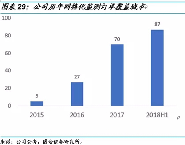 網(wǎng)格化監(jiān)測系統(tǒng)有望成為城市空氣治理之標配。在國家生態(tài)環(huán)境部開展城市空氣質(zhì)量排名的考核排名壓力下,部分省市開始將空氣質(zhì)量考核排名下沉到對鄉(xiāng)鎮(zhèn)空氣質(zhì)量考核,進而開始建設鄉(xiāng)鎮(zhèn)站空氣監(jiān)測項目,2018年上半年公司陸續(xù)中標河南鶴壁,山東菏澤,河北保定、唐山及張家口等地鄉(xiāng)鎮(zhèn)站空氣監(jiān)測建設項目。我們認為隨著城市空氣質(zhì)量排名從地級市下沉到縣級市,并且環(huán)保督察的持續(xù)高壓,網(wǎng)格化監(jiān)測有望成為城市空氣治理的標配。