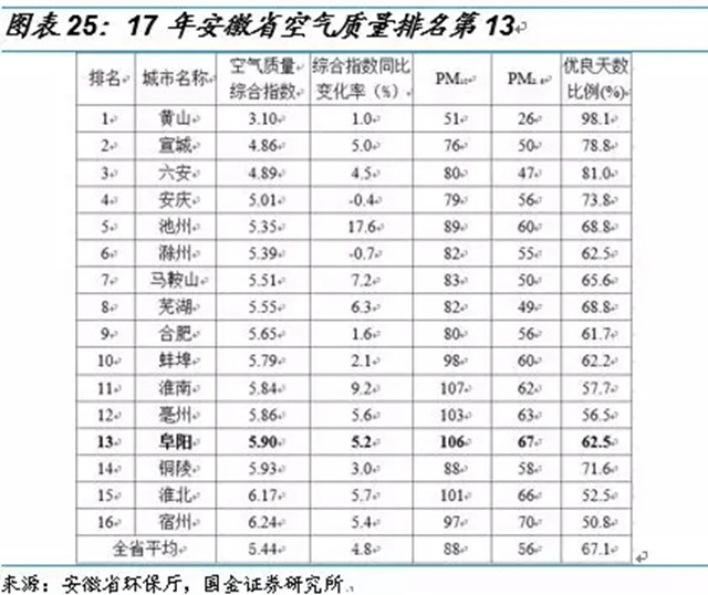 我們以阜陽市為例,2017年大氣污染防治工作考核不合格。2018年3月6日,安徽省政府辦公廳公布2017年度大氣污染防治工作考核結(jié)果。黃山市、合肥市為優(yōu)秀等次,池州市、阜陽市、淮南市、亳州市為不合格等次。考核不合格的四城市將面臨環(huán)評限批,即新增大氣污染物排放建設項目將被暫停審批。
