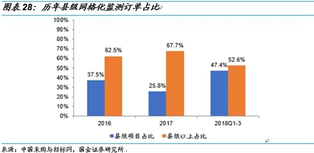 重點區(qū)域(“2+26”城市、汾渭平原、長三角)市場空間預測:1)地級市: “2+26”城市如果全部安裝網(wǎng)格化監(jiān)測系統(tǒng),設備投入為14億,運營投入為3.5億/年;汾渭平原11個城市全部安裝,則設備投入為5.5億,運營投入為1.4億/年;長三角41個城市按照排名靠后的20個城市預測,則設備投入為10億,運營投入為2.5億/年。2)縣級市:經(jīng)過我們統(tǒng)計,目前網(wǎng)格化監(jiān)測項目的縣級市訂單占比已經(jīng)達到45%以上。因此我們假設按照每個縣的設備投入為1500萬,運營投入為400萬/年計算,重點區(qū)域的縣及縣級市(不包括區(qū))的數(shù)量為447個,未來三年按照排名后30%的縣安裝網(wǎng)格化監(jiān)測系統(tǒng),則設備投入為20億,運營投入為5.3億/年。綜上,我們預計未來三年重點區(qū)域的設備市場空間為40億,運營市場空間為12.7億/年。