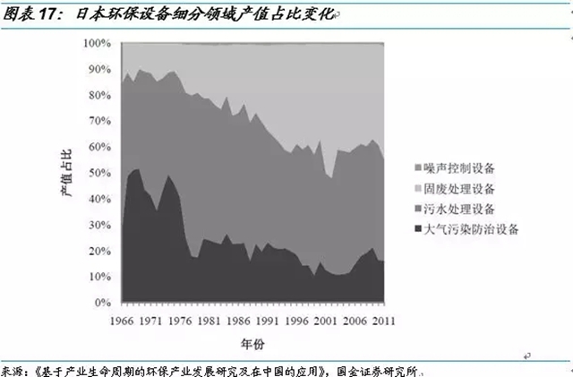 不同階段對應不同細分領域結(jié)構(gòu)變化。日本環(huán)保設備細分領域產(chǎn)值占比中,污水處理設備、固體廢物處理設備、大氣污染防治設備一直占據(jù)并瓜分了90%以上的份額。其中,大氣領域在早期占比最多,而在經(jīng)歷了60-70 年代的高峰后占比逐年下滑,隨后污水領域成為最大主體,但自80 年代中后期也有所下降,相對地,固廢處理領域的占比則逐漸上升,在90 年代以后占據(jù)多數(shù)份額。細分領域的產(chǎn)值占比變化反映了日本環(huán)保產(chǎn)業(yè)內(nèi)部結(jié)構(gòu)性調(diào)整的大趨勢,這也與環(huán)境問題的治理階段相對應。