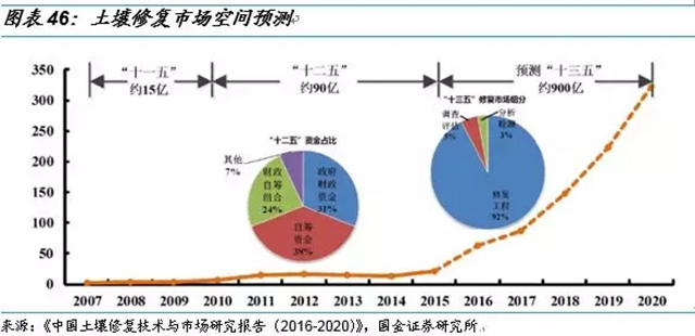 我們預計目前我國每年的土壤修復市場在150-200億之間,根據(jù)《中國土壤修復技術(shù)與市場研究報告(2016-2020)》的預測,“十三五”期間,我國土壤修復市場空間將達到900億,發(fā)展階段將進入快速成長期。