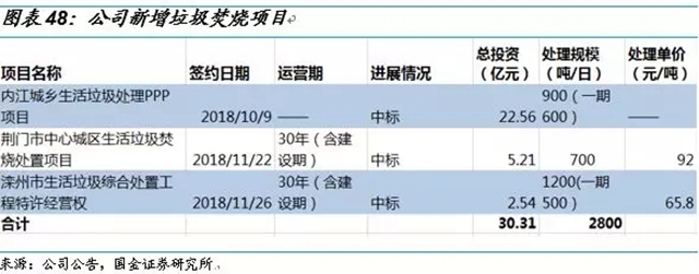 固廢處理在手項目充足,未來業(yè)績增長有保障。公司固廢處理業(yè)務板塊已經(jīng)投運產(chǎn)能11300噸/日,在建及籌建產(chǎn)能約為16000噸/日,在手項目充足,未來產(chǎn)能還有翻倍的空間。我們預計2019年將投產(chǎn)3700噸/日,2020年將投產(chǎn)3000噸/日以上。11月21日,公司以3.7億元收購贛州宏華環(huán)保有限責任公司100%股權(quán),并投資贛州信豐工業(yè)固體廢物處置中心項目。信豐項目危險廢物處置規(guī)模為7.2萬噸/年,其中填埋4.8萬噸/年、焚燒1.5萬噸/年、物化處理0.2萬噸/年、廢鋼制包裝桶回收0.7萬噸/年,安全填埋場總庫容95萬m³,預計于18年12月底正式投入運營。公司原有危廢處置項目為佛山市南海區(qū)項目(9.3萬噸/年),目前在建中。通過收購宏華環(huán)保100%股權(quán),公司危廢處置規(guī)模達到16.5萬噸。此次收購有利于實現(xiàn)公司的危廢業(yè)務戰(zhàn)略布局,符合公司戰(zhàn)略投資方向和業(yè)務發(fā)展規(guī)劃,將為公司創(chuàng)造新的利潤增長點。