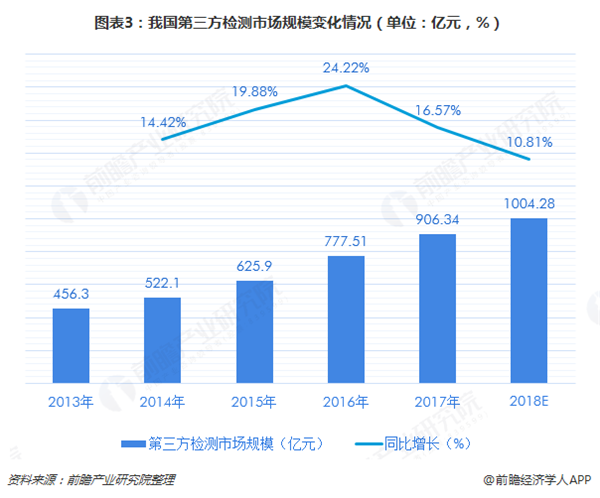 根據(jù)前瞻產(chǎn)業(yè)研究院發(fā)布的《中國第三方檢測行業(yè)發(fā)展趨勢與投資決策支持研究報告》數(shù)據(jù)顯示,2017年我過第三方檢測市場規(guī)模在900億元左右,近年來維持在10%以上的較高增速。預計2018全年第三方檢測市場規(guī)模將突破千億元大關,我國第三方檢測市場將達到新的高度。