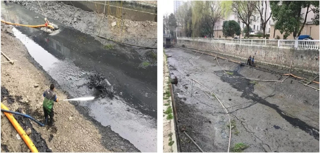 由于河道較窄,清淤船無(wú)法通行,所以清淤采用干河水力沖挖方式,利用水力沖挖淤泥至梁溪河駁船后外運(yùn)至專門的廢土堆場(chǎng)進(jìn)行處理,清淤量總計(jì)約4100m3。