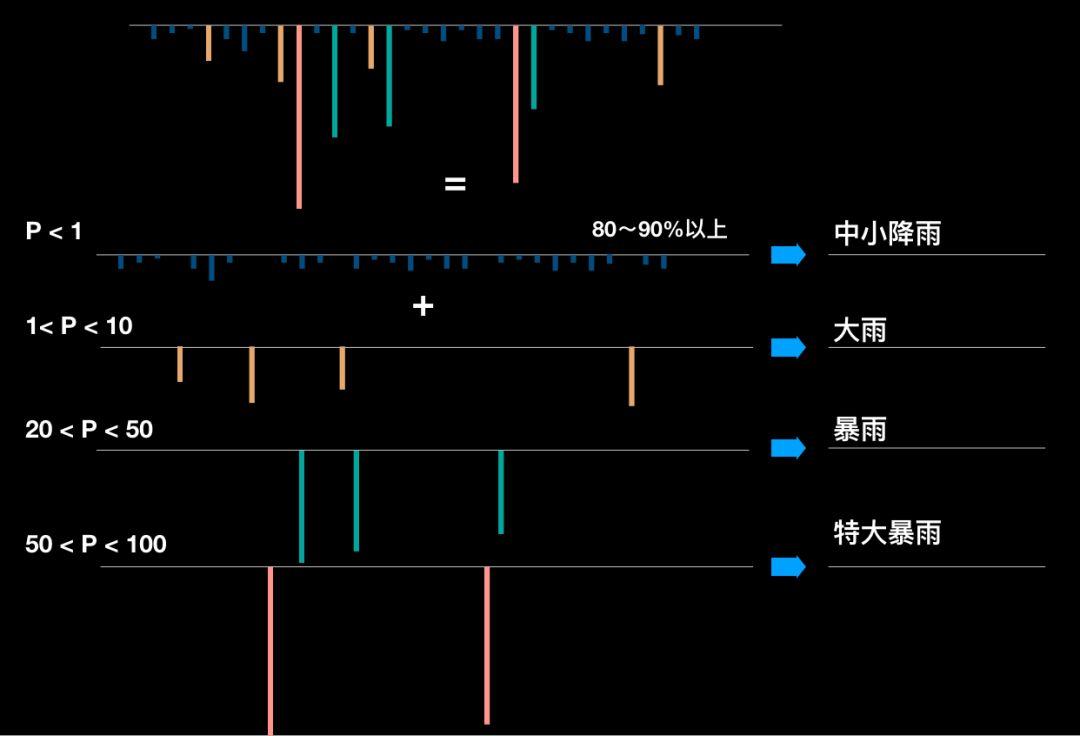 我們現(xiàn)在來(lái)看看怎么科學(xué)地界定這些雨水。我們把雨水用非?!皩I(yè)”的術(shù)語(yǔ)給分類,叫小雨、中雨、大雨和暴雨。這樣分實(shí)際上是有道理的,因?yàn)橐粋€(gè)知識(shí)點(diǎn):重現(xiàn)期。