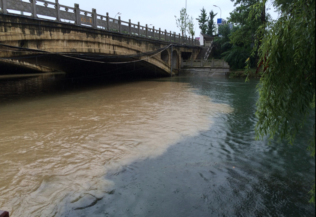這是貴陽(yáng)的南明河,是我老師拍的。整個(gè)南明河本來(lái)是很清澈的,水質(zhì)特別好,有人釣魚(yú),有人游泳。但是一場(chǎng)雨下來(lái)以后,所有的污水、雨水都集中在一個(gè)口里,漫出去了,這個(gè)河道就沒(méi)法要了。