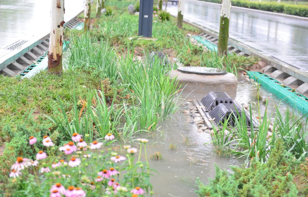 還有這個(gè),看起來(lái)像一個(gè)花園。如果你們家門(mén)口的花園被淹了,可能你們要投訴物業(yè),但事實(shí)上它設(shè)計(jì)出來(lái)就是為了被淹的。我們管它叫雨水花園,或者叫植草溝,把高出地面的綠地沉下來(lái),讓雨水進(jìn)入綠地后再排走。