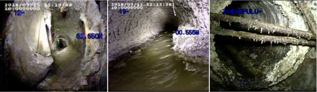這幾張就是在剛才那個(gè)冒出很多污水的農(nóng)貿(mào)市場(chǎng)下面拍的。最左邊這種叫沉積和堵塞,這么大的井口縮成了這么點(diǎn)。第二個(gè)是鋼筋混凝土的腐蝕,就像我們的血管被腐蝕了。第三個(gè)是建筑垃圾,有時(shí)會(huì)損壞管道,形成穿刺。