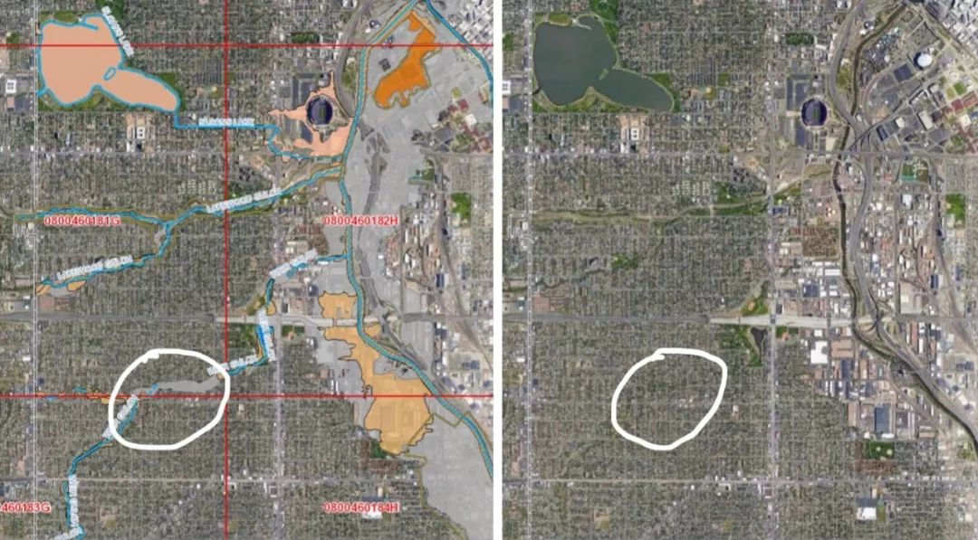 我們從其他地方看到了一些做法,其實(shí)是基于洪澇風(fēng)險(xiǎn)圖很普遍的做法。這個(gè)是美國(guó)丹佛。這個(gè)圖里灰色區(qū)域是特大暴雨才會(huì)淹到的位置,粉色的是比如二十、五十年一遇會(huì)淹到的位置。藍(lán)色的線條就是要大家保護(hù)住的地方,這里能夠讓水通過(guò),一定會(huì)要保留它的通道。