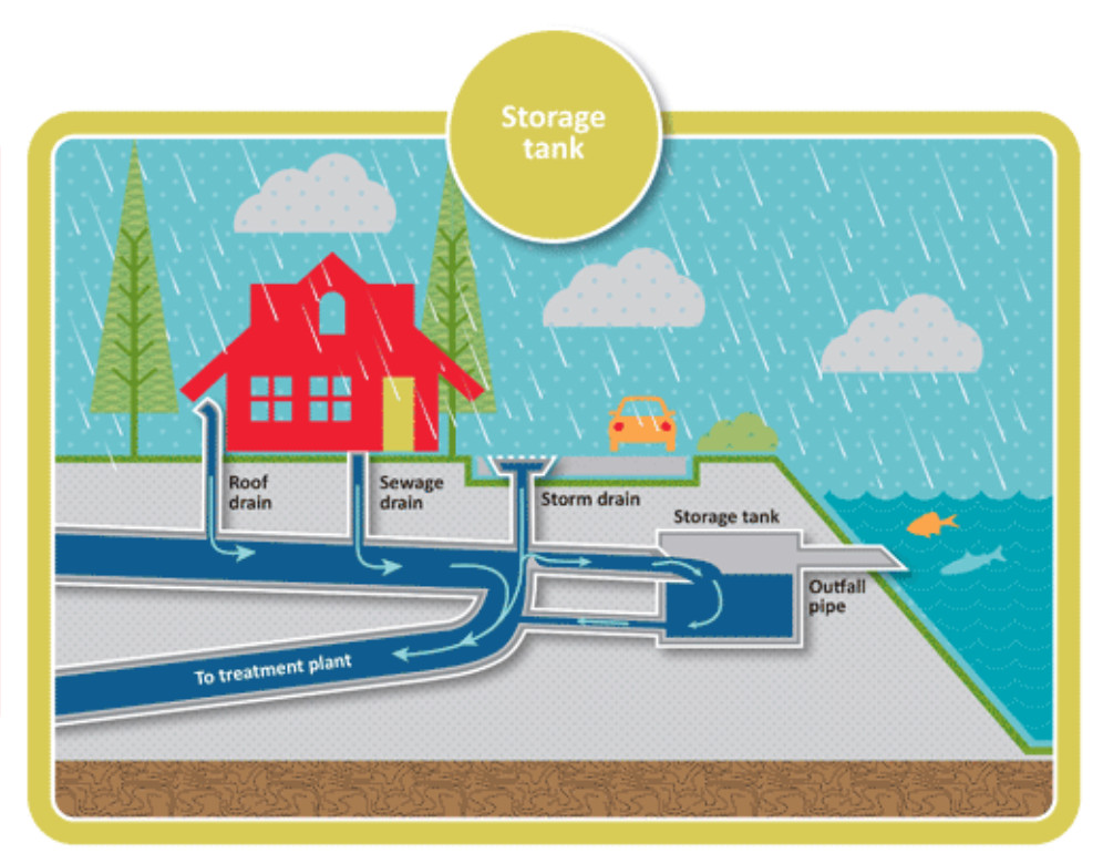 這條溝我們做得大一點(diǎn),平時(shí)讓小水進(jìn)入污水處理廠,大雨可能就翻出去,直接到河道里了,所以很多的污染都是由這種合流制溢流造成的。